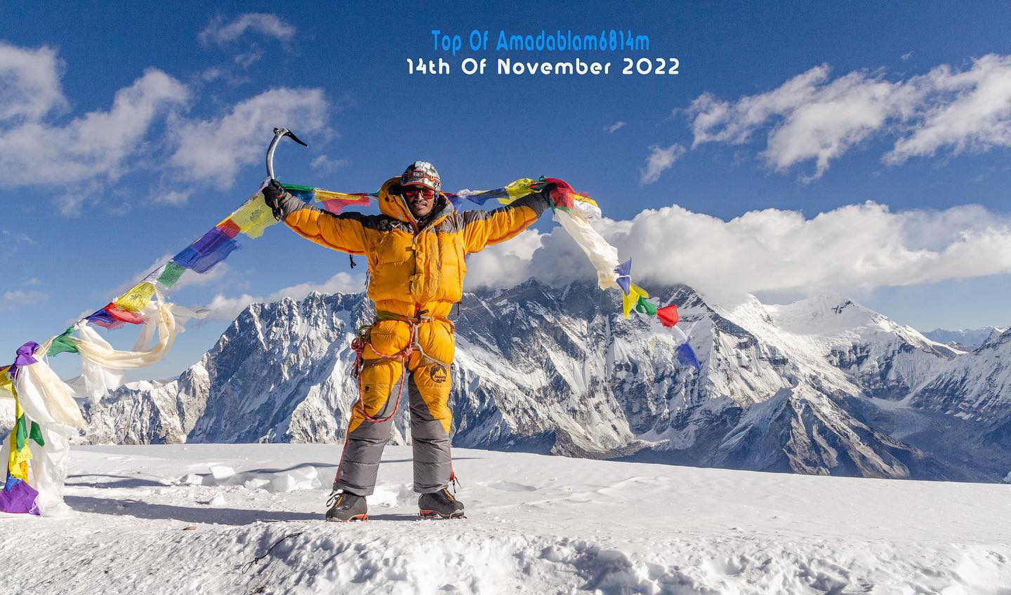 • Mount Everest (8,848m) – 7 times • Mount Lhotse (8,516m) – 2 times • Mount Manaslu (8,163m) – 3 times • Mount Kangchenjunga (8586m) – 1 time • Amadablam (6,812m) – 14 times • Himlung Himal (7126m) – 1 time • And many other six-thousand-meter peaks, including Lobuche Peak, Island Peak, and Mera Peak